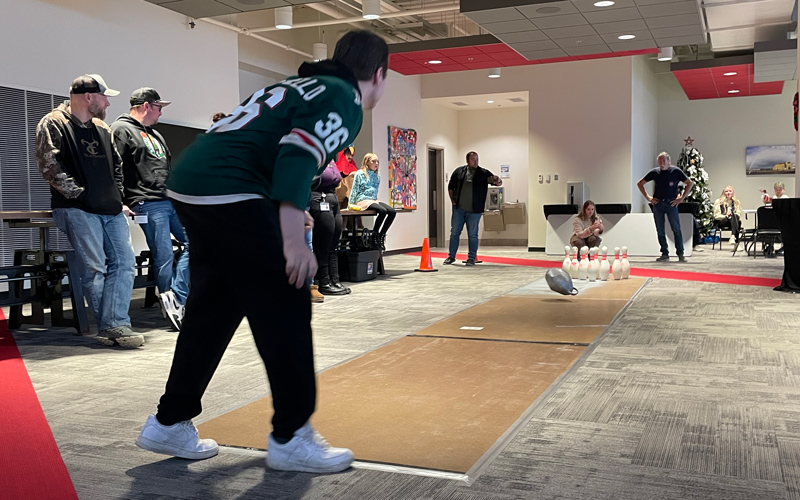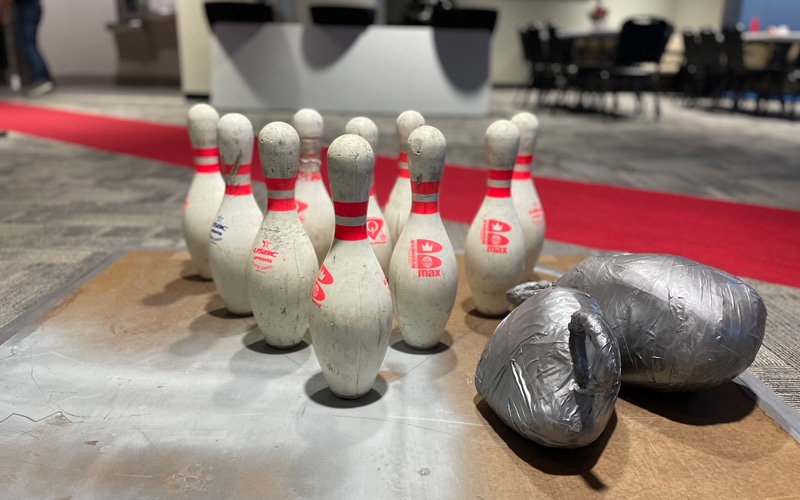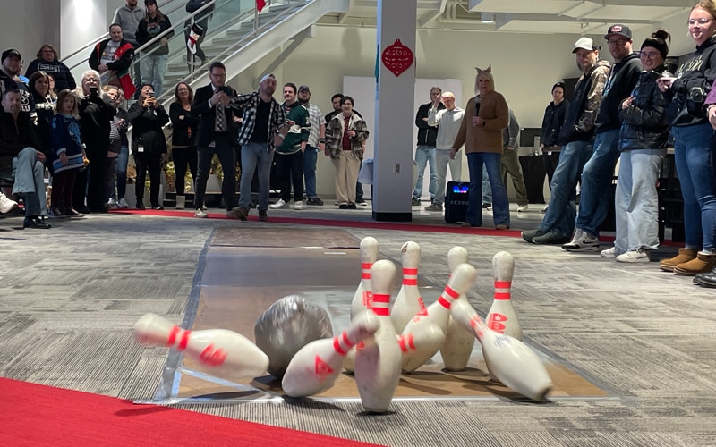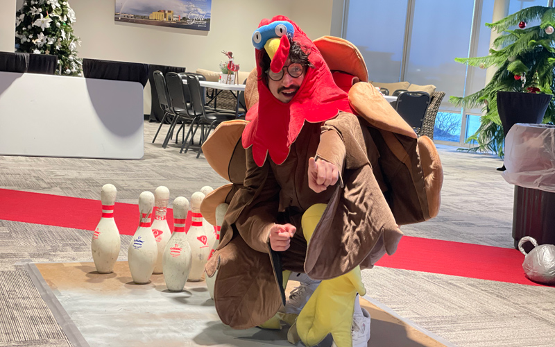Each year, competitors are chosen from every department in the company. Then, they get two chances to use frozen turkeys – choose from large or small – to knock down as many pins as they can and win some cash.